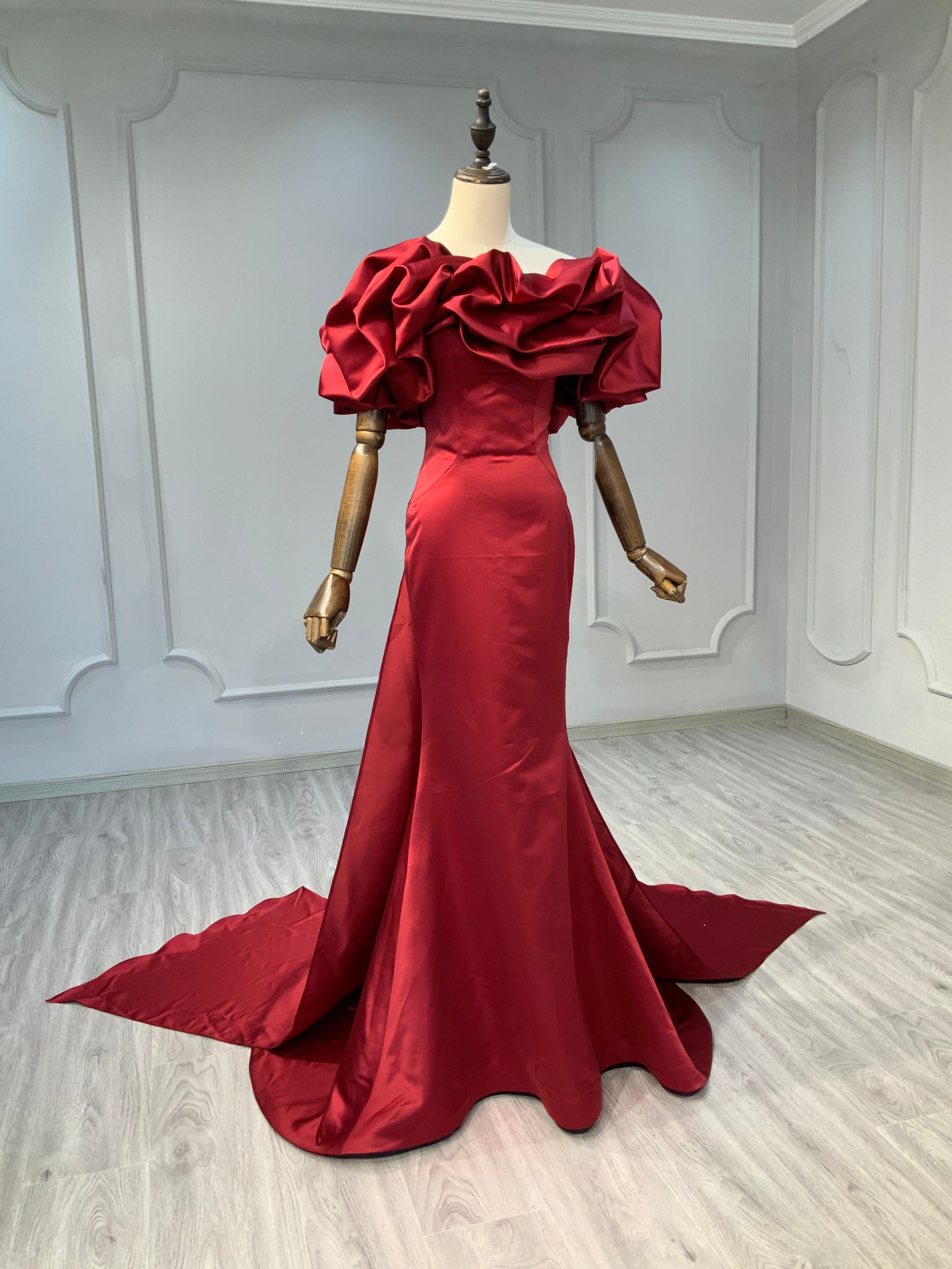 This dramatic red gown by Ostty features bold sculptural puff sleeves, a sleek mermaid silhouette, and a crisp satin finish. The structured neckline and fitted waist create a confident, modern shape ideal for bridal entrances, evening receptions, or engagement parties. A bold and elegant choice for women who want to stand out.