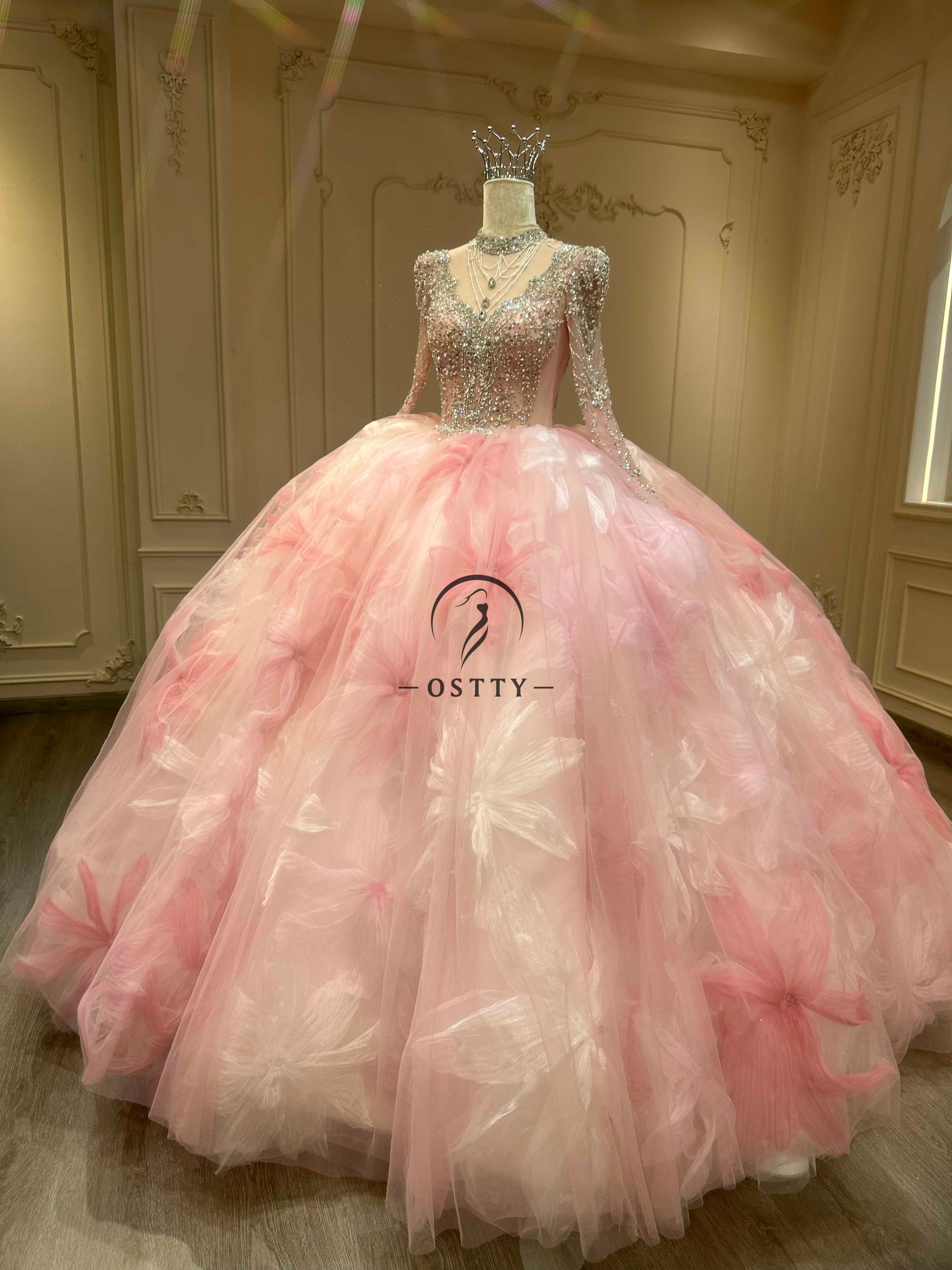 Bring your fairytale to life in this ethereal Blush Butterfly Quinceañera gown by Ostty. Adorned with dreamy 3D butterfly appliqués and glittering crystal beading, this dress captures the magic of youth and elegance. The illusion mesh sleeves with beaded accents offer sophistication, while the full-length train sprinkled with floral textures ensures a breathtaking entrance.